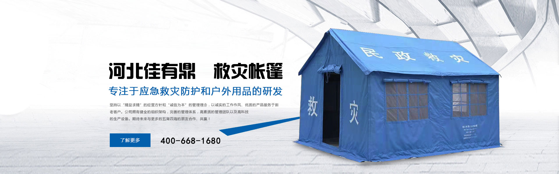 河北佳有鼎科技有限公司原為北京五環精誠帳篷有限責任公司多年來專注于應急救災防護和戶外用品的研發,是一家集研發、設計、生產、銷售、服務于一體的綜合型公司。